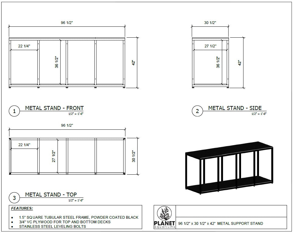 Metal Stands offer the ultimate support for aquariums. The steel square pipe construction offers superior structural integrity and durability. Leveling feet are included to allow you to ensure the aquarium is perfectly level without using shims. The hardwood plywood table top helps to evenly distribute the weight of the aquarium. The bottom is lined with plywood for your filtration system.